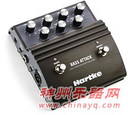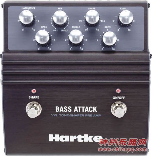 这款贝司效果器采用纯金属外壳,正面配备了7个旋钮,两个脚踏切换开关和两个LED指示灯,其出色的做工和新颖的设计让他在同类产品中脱颖而出。HARTKE BASS ATTACK 具备了贝司前级与DI盒的双重功能。你不仅可以得到你想要的贝司音色同时还避免了信号在远距离传输时,受到无线信号之类外界干扰而产生的噪音(这是DI盒的一个优点)。其可调整的泛音谐波控制,可以调节电子管模拟的数量值,让你获得从温暖甜美肮脏粗犷的所有声音。可调整的塑形均衡线路设计,(大家可能要问,为什么是塑形均衡线路设计?塑形均衡线路设计其实就是一个扩展性的音色控制器,通常他被称为shape,voicing 或者是 contour。)这可是Hartke最富盛名的均衡线路设计,这样可以扫到更宽广的频率范围,并且可以由脚踏开关控制均衡线路的开启状态,让你可以获得各种各样你能够想象得到的经典贝司音色,从Rocco到Jaco,从Geddy Lee 到Marcus Miller,从Chis Maresh到Rex Brown,你可以应有尽有。