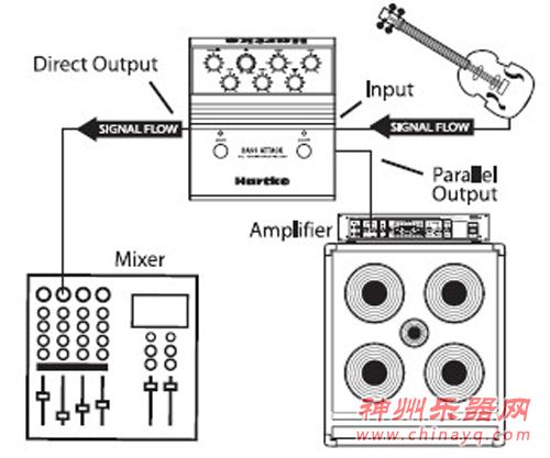在Hartke的侧面还有一个PRE/POST钮,或者线路输出口既可以先于也可以是后于EQ处理。前者称为pre,后者称为post。如果是pre EQ,那么你的音色设置对于进入录音系统或者音箱系统的声音就没有什么影响。如果是post EQ,那么音箱师便要面对你加工过的声音了,他们往往不喜欢这样。因此使用pre/post EQ switch(先后均衡开关)就是一个最佳的解决办法了。而Hartke恰巧为我们解决了这个问题。