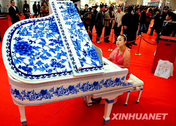 钢琴上布满了蓝色的青花瓷。“它的名字叫琴瓷,琴身上的图案以我国陶瓷工艺中的青花瓷为原型,”现场的工作人员介绍说,这架名为琴瓷的钢琴是专门为前不久举办的国际乐器展览会制作的,琴身上的瓷纹是由技术人员手工雕刻而成,目前在世界上仅有这一架,市场售价在30万元左右。