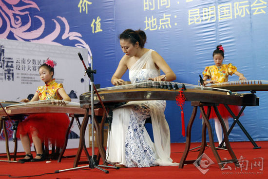 神州乐器网讯 8月7日,2015云南文化产业博览会现场,20余首古筝名曲从云南女子红乐坊老师和学生的指尖不断流出,让本届文博会现场充满古典韵味,参会观众得到了丰盛的视听享受。