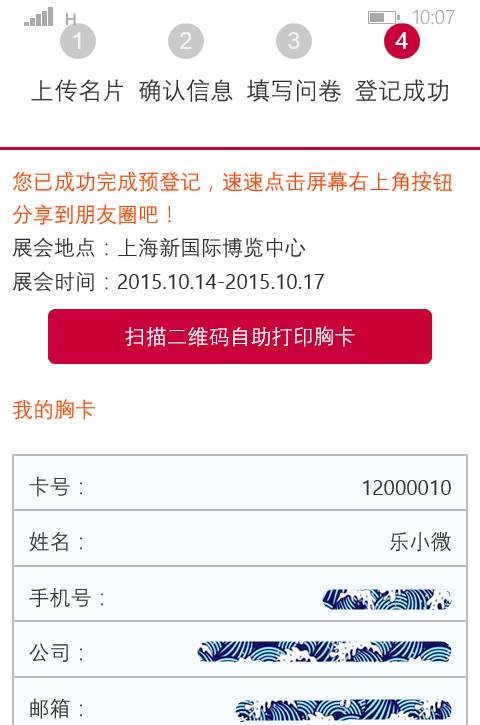 展商、经销商、零售商等商务人士,可点击“上传名片快速预约登记”,您会进入手机相册,选择名片的照片上传,系统会识别文字,自动生成胸卡,简便省时!