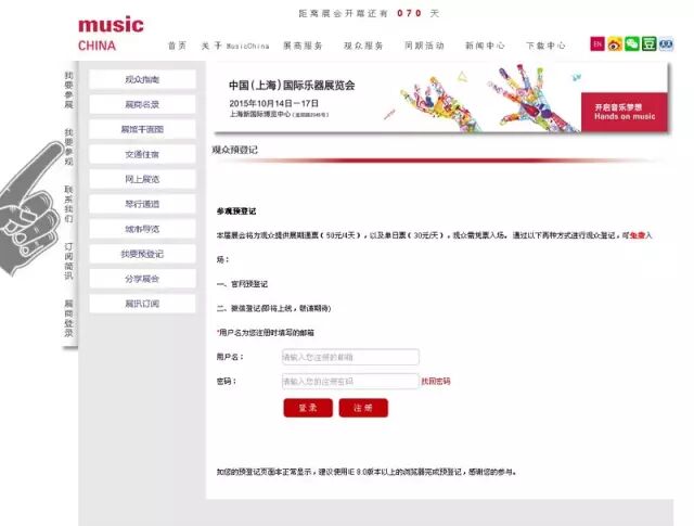 点击左边栏“我要参观”,出现如下界面后,先进行注册: