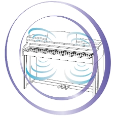 三角钢琴的内部最后面的一块大金属钢板,也就是响板,连着调音钉,紧贴着琴弦,当琴弦被引发振动而发出声音时,响板会使声音产生双重共鸣,即将声音透过响板反射以及扩大出来。为了更逼真的效果,卡西欧CELVIANO Grand Hybrid系列配备了全新的扬声系统, 4路音频系统通道配置了6个扬声器,巧妙地安放在恰当的位置结构当中,以保证声音从内部向外释放时所带来的真实感,给演奏者更愉悦的演奏体验。