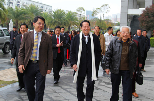 在众人的陪同下,庄炳生(中)参观南洋学院