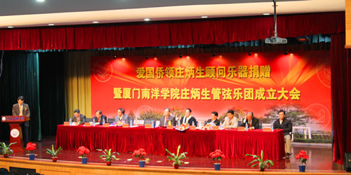 神州乐器网讯 1月11日,著名爱国侨领庄炳生来到厦门南洋学院,向该校捐献了价值100万元的乐器,助该校成立庄炳生管弦乐团,并担任顾问。