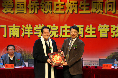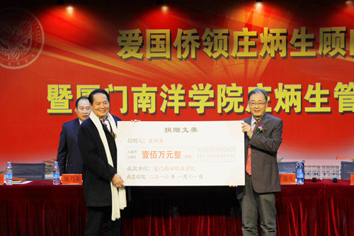 南洋学院校长王豫生(右)代表学校接受庄炳生捐赠