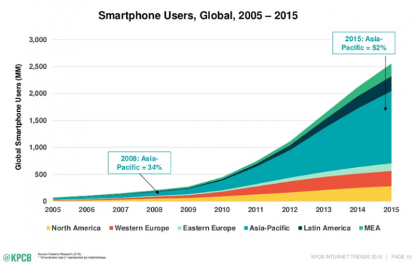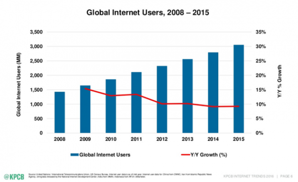 被誉为“互联网女皇”的凯鹏华盈(KPCB)合伙人玛丽·米克(Mary Meeker)周三公布了2016年《互联网趋势》(Internet Trends)报告,这是她第21次公布这一年度互联网报告。过去21年时间里,米克的年度《互联网趋势》报告已经成为了科技行业内部重大发展趋势的一个重要信号。在今年的报告中,米克追踪了智能手机销售速度放缓、移动广告行业和广告拦截增长、社交活动的视频化、交通运输的未来以及信息传送、机器人和语音助理服务的崛起等趋势。