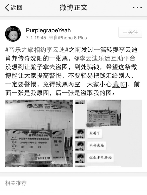 近日,一名女网友在新浪微博上发帖称:“之前我发过一篇转卖李云迪肖邦传奇沈阳音乐会门票(686元)的帖子,没想到让骗子拿去盗图,到处骗钱!”