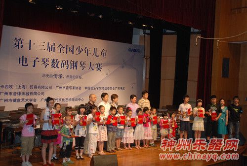 第十三届全国少年儿童电子琴、数码钢琴大赛广东选拔赛在5月29日落幕,甲、乙、丙、丁四个年龄组的一等奖、二等奖、三等奖选手揭晓。5月30日,组委会在星海音乐厅举办了本次赛事的颁奖音乐会,除了表彰以上四个组别的一、二、三等奖选手外,也颁发了优秀奖和园丁奖。获奖选手代表随后登台现场演奏,28台数码钢琴组成的键盘管弦乐队压轴表演,掀起现场最高潮。