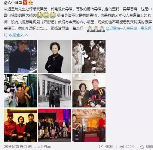 六小龄童写到:“从迟重瑞[微博]先生处惊悉,我国第一代电视女导演、尊敬的杨洁导演去世的噩耗,异常悲痛,这是中国电视剧的巨大损失。杨洁导演不仅是我的恩师,也是我的艺术和人生道路上的老师,没有央视版电视剧《西游记》就没有今天的六小龄童,观众们也不可能看到我扮演的银屏美猴王。我们永远怀念您……愿杨洁导演一路走好!”