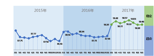 中国轻工业经济运行及预测预警系统数据显示:2017年以来,中轻景气指数自今年年初重回绿色“稳定”区间,并持续在稳定区间震荡运行,说明今年以来,轻工业经济运行有企稳回暖态势。9月,中轻景气指数为90.40,较上月小幅回升0.02点,该指数在本年6月上升至年度最高点后,连续两月小幅下降,本月呈现止跌企稳态势。