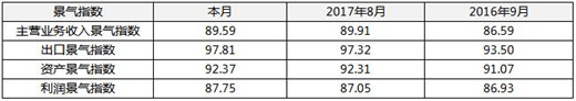 从分指标运行指数来看,除主营业务收入指数外,其他三项分项指数环比上月均小幅回升,利润景气指数回升幅度最大,其中:利润景气指数87.75,环比升0.7点;出口景气指数97.81,环比升0.49点;资产景气指数92.37,升0.06点;主营业务收入景气指数89.59,环比降0.32点。