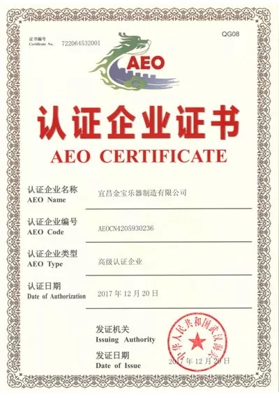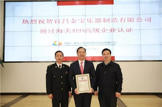 2017年12月20日,经严格考核,柏斯音乐集团旗下宜昌金宝乐器制造有限公司顺利通过认证,获颁国际贸易最高等级“信用通行证”——“海关AEO高级认证企业证书”,成为湖北自由贸易试验区宜昌片区成立以来首家获此殊荣的企业。
