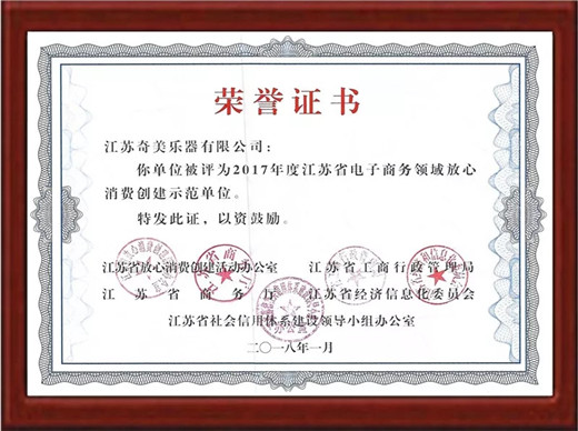 近日,江苏省放心消费创建活动办公室、江苏省工商行政管理局、江苏省商务厅、江苏省经济和信息化委员会、江苏省社会信用体系建设领导小组办公室五部门,联合授予奇美公司为2017年度江苏省电子商务领域放心消费创建示范单位,奇美乐器天猫官方旗舰店获评江苏省首批放心消费示范网店。