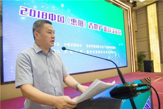 惠州市惠阳区文化广电新闻出版总局局长马雄辉首先致辞,代表论坛主办方对莅临领导、专家学者、业界代表以及新闻界朋友表示热烈欢迎和衷心感谢!美丽惠阳历史悠久、人杰地灵,地处珠三角经济圈东部,系“深莞惠1小时经济圈”、粤港澳大湾区的枢纽中心。惠阳现有吉他及相关企业200多家,产量占全国的60%,占全世界的25%,尤克里里更是占全球的80%,拥有自主吉他品牌120个,形成从原材料供给、半成品、电子五金配件、装饰包装、数控机械、成品等完整的产业链。