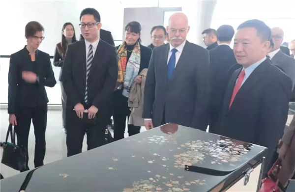 11月29日,新任德国驻华大使葛策先生到访中德生态园,中德生态园管委主任赵士玉接待了大使一行。葛策大使参观了中德生态园D-ZONE、礼贤馆和德国企业中心。在礼贤馆,悠扬的琴声与精美绝伦的德国欧米勒彩绘钢琴吸引了葛策大使的驻足。在中德生态园管委主任赵士玉的介绍下,葛策大使仔细浏览了著名画家在德国欧米勒钢琴上的彩绘创作,对德国钢琴制造工艺与中国绘画的完美结合发出了赞叹。