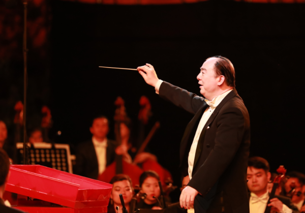 俞峰院长激情澎湃地指挥乐团、合唱团