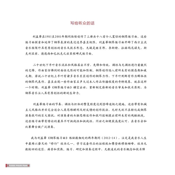 国内外历来极少有钢琴家完整公演全套利盖蒂钢琴练习曲。邹翔说:“利盖蒂钢琴练习曲极其繁杂的复合节拍、复合调性以及微复调织体对钢琴家提出了“非人性”的多维度挑战。相比录音棚录制,现场音乐会中连续演奏所有练习曲,其过程对于思维运作、技术驾驭和音乐表达的即时把控,以及迅速“转换”于每首练习曲之间截然不同的高难技术状态,都是对于钢琴家的残酷考验。现场音乐会生动真实地记录了我与作品所特有的‘机械化思维’之间一场惊心动魄的博弈过程,以及动态音乐会表演对于一系列蕴含不同创作和表演难度制高点的练习曲进行‘无缝隙’的控制和表达。”