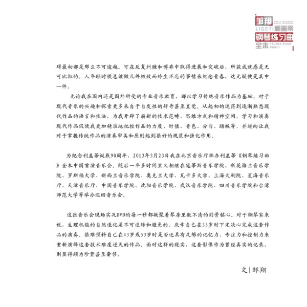 中央音乐学院钢琴系邹翔教授演奏的《利盖蒂钢琴练习曲》全本DVD近日由北京环球音像出版社出版发行。2013年为纪念利盖蒂诞辰90周年,钢琴家邹翔曾举办全套利盖蒂《钢琴练习曲》中国首演独奏会,成为国内音乐界广泛关注的热点。英国《国际钢琴》杂志曾撰文称赞他为“中国演奏现代音乐的领军人物”。中国《钢琴艺术》杂志不多见地刊发三篇评论文章的特稿及专访《艺术在“自虐”中净化与升华》进行报道。