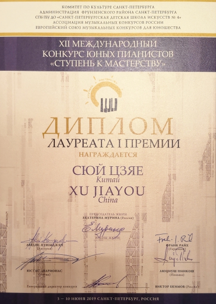 6月10日,俄罗斯圣彼得堡“通往大师之路”国际青少年钢琴大赛,经过10天三轮激烈的淘汰赛,最终我校附小五年级学生徐嘉佑(指导教师:权洪波)摘得A组第一名。
