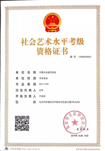 2019年6月10日,经北京市文化和旅游局批准,中国大众音乐协会获颁《社会艺术水平口琴考级资格证书》,标志着中国大众音乐协会正式成为首家拥有在全国各省、市、自治区开展社会艺术水平口琴考级机构资格的单位。今后,中国大众音乐协会的直属分支机构——口琴专业委员会将作为全国口琴考级常设工作机构,承担在全国范围内组织开展口琴考级相关的各项工作。