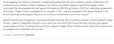 除了表演,梦阳也对教学充满热情。她目前是皇家音乐学院、英国皇家音乐学院、布莱斯音乐和视觉艺术中心以及圣保罗男孩学校的钢琴教授。她还在普赛尔学校、帝国学院、圣保罗学校和她的祖国中国等学校开设了正规的大师班,这些活动受到了相当大的好评。(布罗德伍德钢琴)