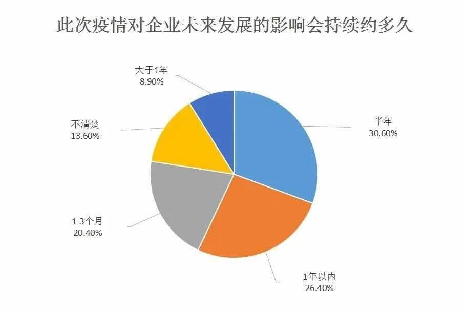 参与调研的企业中,认为疫情对企业未来发展的影响持续在三个月的有48家,占比20.40% 。另有56.4%的企业表示,订单累积,采购空窗,资金紧张,出口受阻,人员缺失等造成的影响,至少需要半年以上的时间来消化。