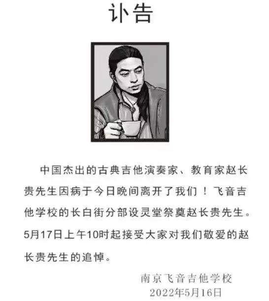 2022年5月16日晚,中国著名古典吉他演奏家、教育家赵长贵因病医治无效,与世长辞,享年54岁。随后南京飞音吉他学校发布讣告。