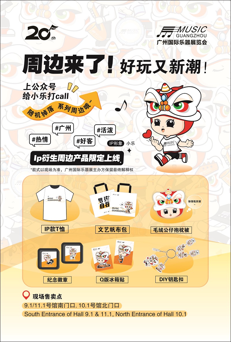 为迎20周年庆,展会推出广州国际乐器展IP形象“小乐”,并在此基础上设计了一系列限定周边产品,通过独特、有趣的设计来传达文化价值和情感体验。周边产品将于展会现场以实惠价格限定发售。此外,展会“微信粉丝俱乐部”升级“极速寻宝”和“幸运红包”活动,抽送华为平板、华为手表等,将为观众带来更多的惊喜和欢乐。