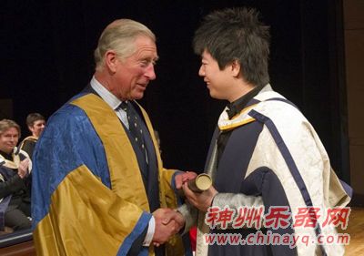 5月12日,在英国伦敦的英国皇家音乐学院,英国王储查尔斯(左)向中国钢琴家郎朗颁发荣誉博士学位证书后交谈。当天,英国皇家音乐学院授予中国钢琴家郎朗音乐荣誉博士学位,以表彰他在艺术、慈善、教育领域中作出的贡献以及对年青一代的广泛影响力。