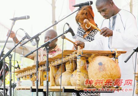 在非洲钢琴艺术节上,非洲音乐家们用葫芦制成的“钢琴”敲出美妙的音乐。 (记者 冯炜 摄)