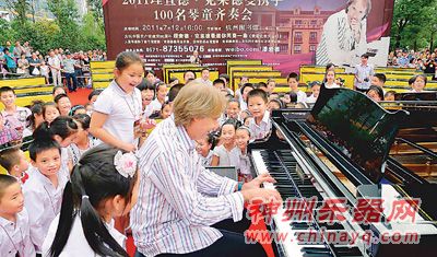 7月12日,法国钢琴演奏家理查德·克莱德曼与百名浙江琴童在杭州图书馆广场举行齐奏会。