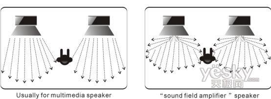 下面我们分享一下什么是“声扬扩展”技术?音响播放出的声音在空间的分布称为声场,并且声场的分布并非均匀,会依据听音环境的不同和距离的远近有很大差别,因而人在听音时,在环境中不同位置感受到的听音效果是有很大差别的。在听音环境中,相对音响所摆放的位置有近声场和远声场的区别。一般针对多媒体音响而言,1.5米以内称为近声场,1.5米之外称为远声场,普通的音箱在近声场处听音,不管是从音质还是声场定位效果方面都比较差。而国立音箱S3105采用独有的 “声场扩展”技术,有效地解决了近声场听音效果差的缺陷,使听音者在听音环境的任何位置都有效果逼真,音色完美,声音定位精准的音效表现,示意图如下: