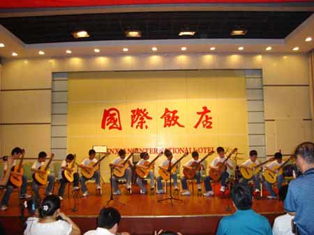 开场是由月光琴行的月光2008爵士乐队合作,演绎了一曲节奏欢快的爵士乐。接下来是由8岁的李锐演唱的一首《小城故事》,稚嫩的童声在优美的吉它伴奏声中响彻大厅。稚嫩的童声与前面的乐队形成一动一静的音响效果。紧接着是由十二人组成的合奏《爱的罗曼史》,十二个人代表十二个月,经久不衰的经典之作《爱的罗曼史》历经全年,让我们沐浴在爱的海洋中。12岁的翟雷带给我们的是《罗利安娜乐曲》,这是意大利吉它之父莫扎尼(L.Mozzani)的作品,此曲中高把位的指法安排及右手的运指,都让我们觉得此曲是多么的巧妙也是那么完美……。历久弥坚的《橄榄树》和《斯卡保罗集市》由赵腾演唱,张冠亚伴奏,犹如天籁之声的嗓音加上吉它单纯的伴奏,配合的堪称完美。古典曲子《“樱花”主题变奏曲》由同样12岁的王启东演奏,虽然还显稚嫩生涩,但是已经略显演奏者的风范了。金勇的一曲《从头再来》让我们热血澎湃。张鸾的一曲《卡瓦蒂娜》,优美的旋律和真挚的情感打动了观众。委内瑞拉吉它演奏家、作曲家劳罗的《委内瑞拉圆舞曲2号》由廖草为大家演奏,动听的旋律加上多变的节奏,使大家沉浸在音乐中。《虹》(原创古典吉它曲)是由特邀嘉宾刘鸿老师创作的一首现代古典吉它乐曲。乐曲旋律和节奏以船歌体裁加以现代和声的映衬,描绘了经历暴风雨之后,天空出现美丽的彩虹,那清新而又温润的空气里渗透出大自然雨后的芬芳,彩虹七色的光芒像梦境的拓映和迷幻一般,带给人们心中难以言喻的愉悦,表现出新浪漫主义的气息。李森的英文歌曲《是爱让我们生存》由月光2008爵士乐队伴奏,演绎的淋漓尽致。肖邦曾说:“没有比一把吉它的更好听的了,除了两把吉它。”这是大师对吉它的二重奏的赞美。卡鲁里的《回旋曲》由双胞胎赵芳、赵蕾演奏,双胞胎的默契使她们配合的天衣无缝。