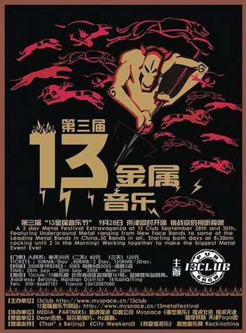 从9月28日至9月30日,13金属音乐节”就要开幕了。每晚八点到凌晨2点,冰镇啤酒和最好的金属音乐为你创造可以飞起来的不眠之夜。“活跃在中国顶尖级的地下金属明星以及地地下新军汇集在北京著名的LIVE HOUSE —13club,带给你最重、最POWER、最疯狂的金属强音,近30支风格各异的METAL BANDS 挑战你的视听极限,考虑到前两年火爆的现场,今年将现场从北京延伸到天津,并同时发行07年金属节DVD,这将创造中国摇滚乐首次京津两地同时上演音乐节。