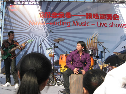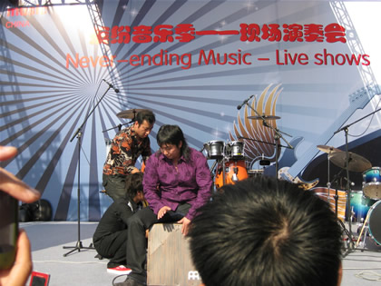 10月15日,上海乐器展览会的第三天,由著名打击乐艺术家王宏涛,在贝司手和鼓手的默契配合下,现场的精彩演出,引来了众多观众的观看。