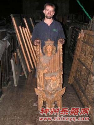 “这架剧院管风琴演奏台就有普通钢琴大小,有两层手键盘,每层有61个键,并有脚键30个。由于这台管风琴有1200根音管,其组件最大的有