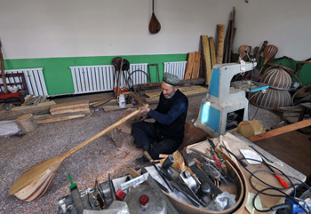 今年58岁的吾拉木·吐尔逊是喀什市多米特巴格乡塔吾古孜村的一名民族乐器制作艺人。他从十多岁开始就和哥哥学习民族乐器制作,经过四十多年的学习和实践,如今吾拉木·吐尔逊已能熟练制作“弹拨尔”、“都它尔”、“热瓦甫”和“手鼓”等乐器,每年仅从乐器制作上就可以收入三万多块钱。随着中央新疆工作座谈会确定新疆喀什为实行“特殊政策”的区域后,前来吾拉木·吐尔逊这里购买民族乐器的人也越来越多。